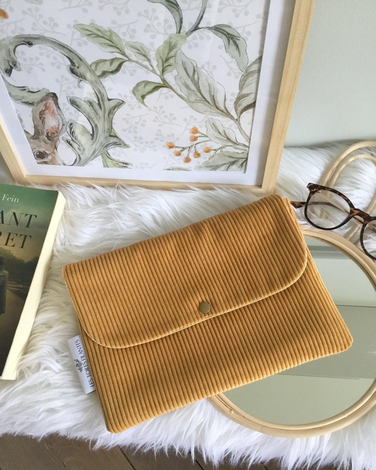 Elles sont réalisées dans le velours grosses côtes de votre choix. L'intérieur est en coton uni écru ou sur option dans le tissu imprimé de votre choix. Un passepoil doré ou argenté souligne élégamment le rabat.